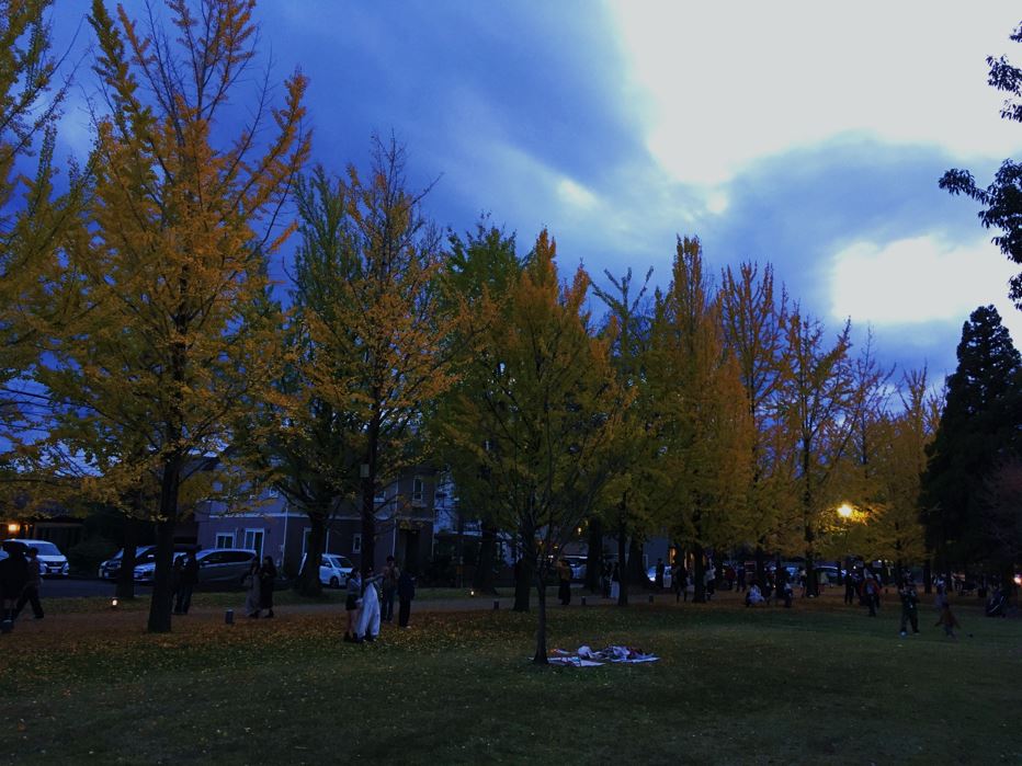 イチョウ並木が綺麗で、たくさんの人で賑わっています。ガラス張りのカフェの前には芝生広場が広がっています。子どもたちはその芝生の坂になっている所で、ゴロゴロ転がったり、上り下りしたりと、とにかく元気。今夜は疲れて早寝かな。